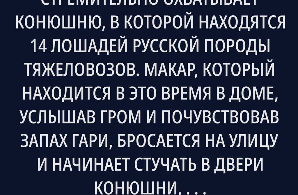 Вспыхнувший пожар стремительно охватывает конюшню, в которой находятся 14 лошадей русской породы тяжеловозов. Макар, который находится в это время в доме, услышав гром и почувствовав запах гари, бросается на улицу и начинает стучать в двери конюшни, чтобы спасти животных от беды.