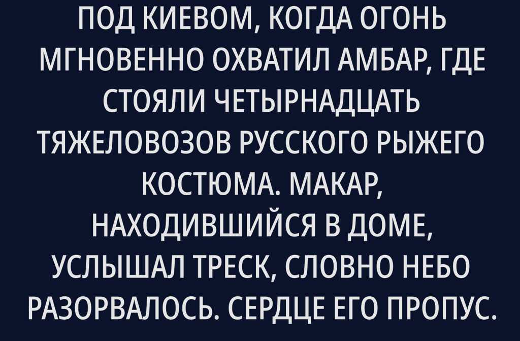 Вспышка молнии в ту ночь осветила окраину старого села под Киевом, когда огонь мгновенно охватил амбар, где стояли четырнадцать тяжеловозов русского рыжего костюма. Макар, находившийся в доме, услышал треск, словно небо разорвалось. Сердце его пропустило удар он ринулся к хрупкой двери амбара, не думая о себе. Кулаками и плечом он колотил в дверь, крича и звал лошадей на спасение сквозь рев стихии.