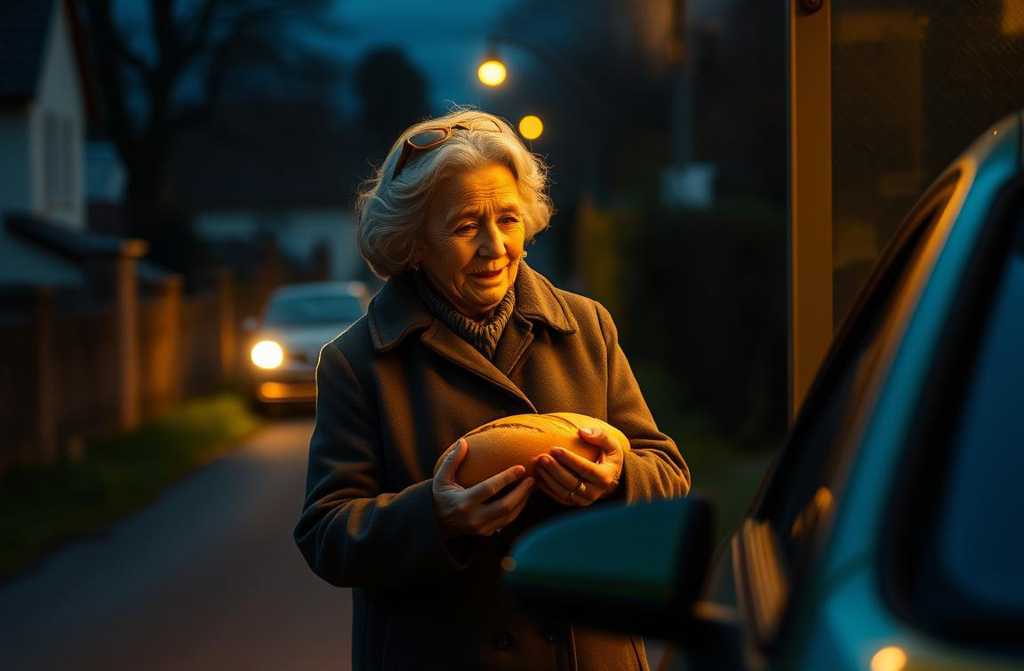 Смотря в даль, она всё так же вела машину, размышляя о странных, почти абсурдных семейных связях. На одном участке окружная дорога прошла через крошечную деревушку. Валентина, как полагается, сбросила скорость, и вдруг, у автобусной остановки, в свету фар, заметила пожилую женщину с завернутой в тряпку вещью, нежно прижимающей её к груди, будто это младенец. Женщина смотрела на приближающиеся машины с такой надеждой, что Валентина, не задумываясь, нажала тормоз.