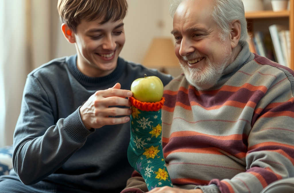 Когда Артём вырос, окончил университет и получил хорошую работу, он ни на миг не забывал своего дедушку. Семья жила вместе, поддерживая друг друга. В свой последний день рождения Артём подарил дедушке носок с зелёным яблоком на нём. Старик был несказанно рад и со смехом заявил, что теперь в его носке каждый день появляется волшебное яблоко. Волшебная связь между Артёмом и дедушкой осталась крепкой, наполненной любовью и благодарностью за тепло и самые особенные подарки друг другу.