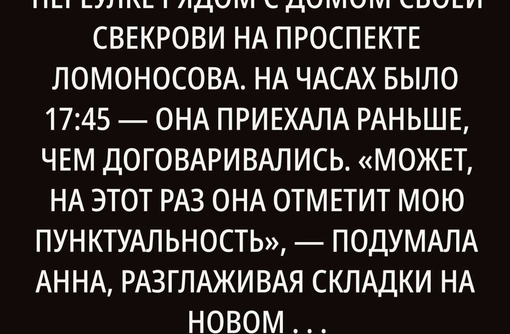 Анна остановила машину в переулке рядом с домом своей свекрови на проспекте Ломоносова. На часах было 17:45 она приехала раньше, чем договаривались. «Может, на этот раз она отметит мою пунктуальность», подумала Анна, разглаживая складки на новом платье от российского дизайнера. Подарок старинная брошь, которую она целых полгода разыскивала у коллекционеров в Москве и Петербурге, аккуратно лежал на заднем сиденье, обёрнутый синей лентой.