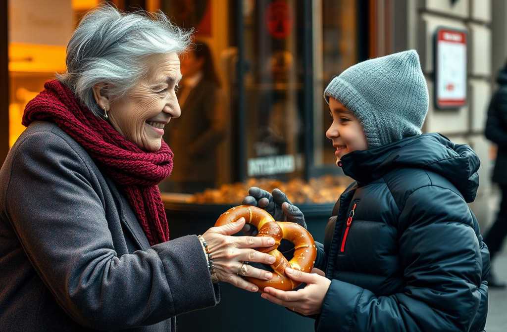 Тишина. Продавщица на мгновение замерла, затем внимательно посмотрела на них, увидела их скромные одежды, поношенные ботинки Вани, трудные руки старушки. Чтото смягчилось в её сердце. Она без слов достала два больших бублика, положила их в пакет и протянула бабушке.