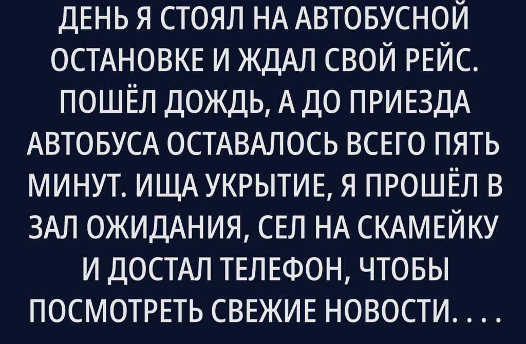 В один прохладный осенний день я стоял на автобусной остановке и ждал свой рейс. Пошёл дождь, а до приезда автобуса оставалось всего пять минут. Ища укрытие, я прошёл в зал ожидания, сел на скамейку и достал телефон, чтобы посмотреть свежие новости. Рядом присела живая и энергичная пожилая женщина, и мы завели разговор. Было очевидно, что она настроена общаться, и мы начали говорить о разных мелочах, например, о погоде. Она оказалась очень словоохотливой и вскоре поделилась историей своей жизни.