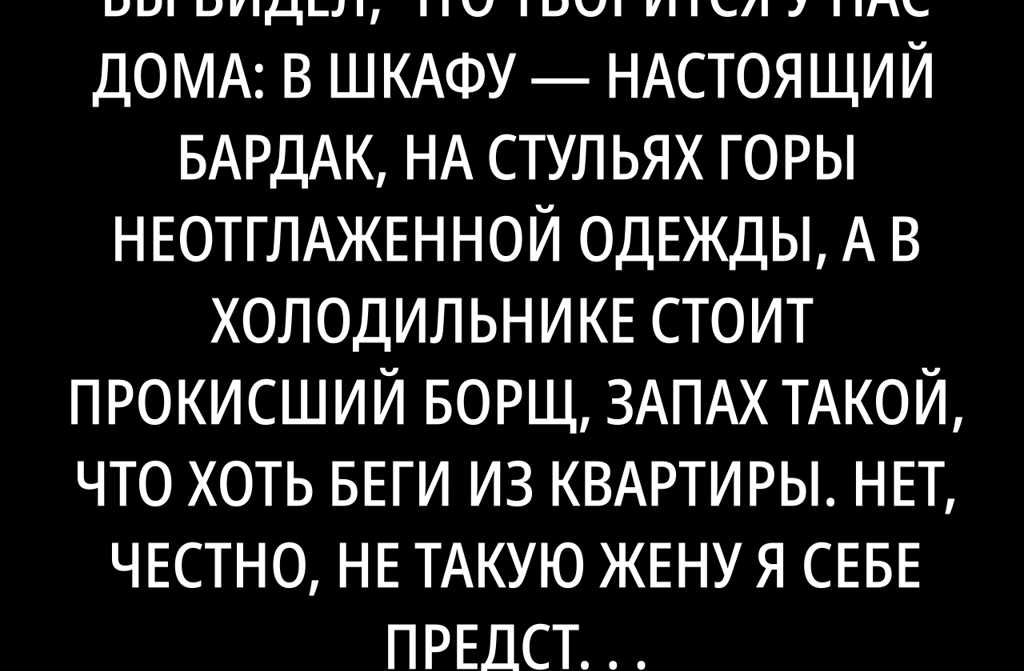 Ну слушай, вот в чем дело. Ты бы видел, что творится у нас дома: в шкафу настоящий бардак, на стульях горы неотглаженной одежды, а в холодильнике стоит прокисший борщ, запах такой, что хоть беги из квартиры. Нет, честно, не такую жену я себе представлял, когда женился, но со временем вот что получилось.