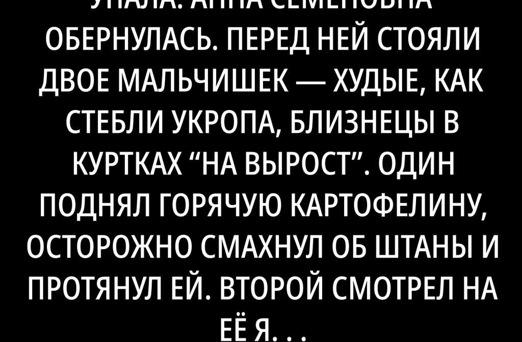 Анна Семёновна обернулась. Перед ней стояли двое мальчишек худые, как стебли укропа, близнецы в куртках на вырост. Один поднял горячую картофелину, осторожно смахнул об штаны и протянул ей. Второй смотрел на её ящик с варёной картошкой так, как кот на сметану.