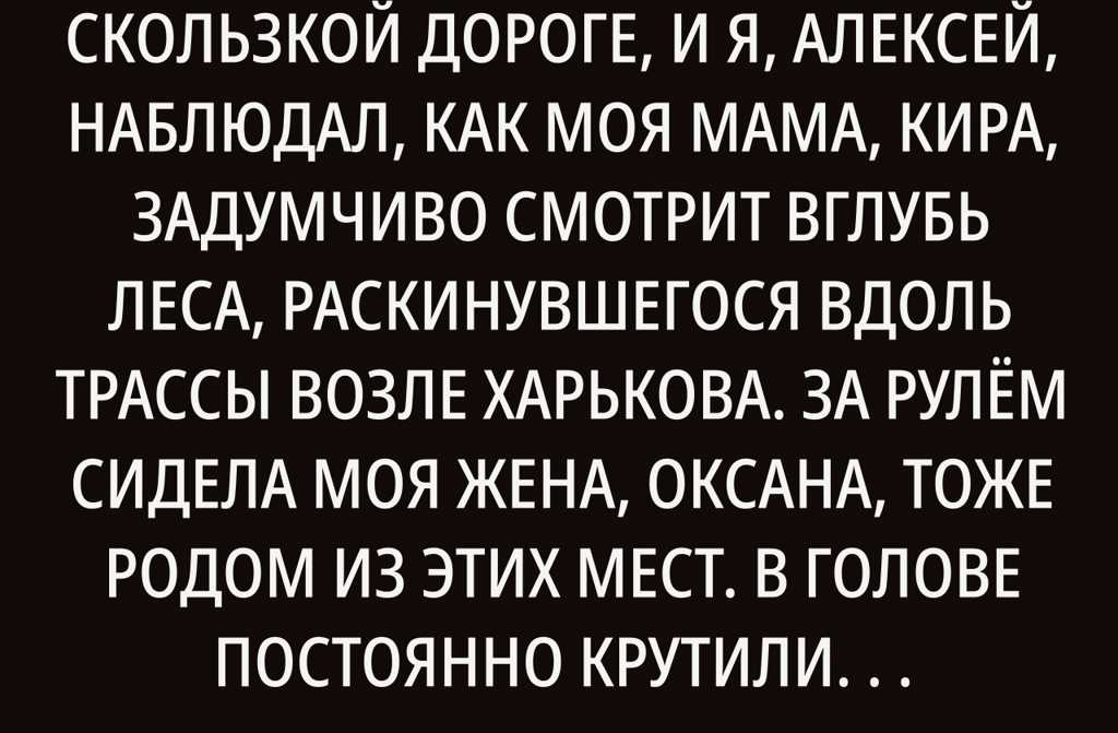 Автомобиль спокойно ехал по скользкой дороге, и я, Алексей, наблюдал, как моя мама, Кира, задумчиво смотрит вглубь леса, раскинувшегося вдоль трассы возле Харькова. За рулём сидела моя жена, Оксана, тоже родом из этих мест. В голове постоянно крутились мысли неужели я правда отвожу родную мать в дом престарелых? Где я ошибся, когда воспитывал себя? Может, я недостаточно проявлял заботу, хотя всегда старался и делал всё ради неё, чтобы она была счастлива. Но у меня, у Алексея, всегда было своё мнение.