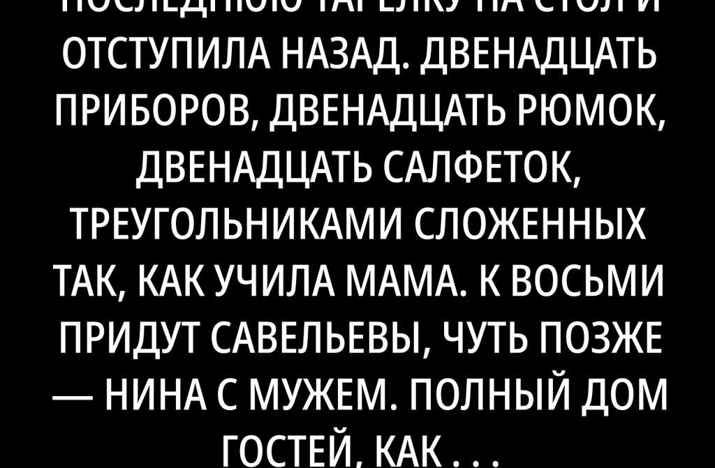 Я аккуратно поставила последнюю тарелку на стол и отступила назад. Двенадцать приборов, двенадцать рюмок, двенадцать салфеток, треугольниками сложенных так, как учила мама. К восьми придут Савельевы, чуть позже Нина с мужем. Полный дом гостей, как мама всегда любила. Белая скатерть с вышитыми углами снежинками мамина, из её приданого. Я разглаживала складки, думая о том, что вот уже третий Новый год собираю людей и накрываю этот стол без неё. Совсем одна.