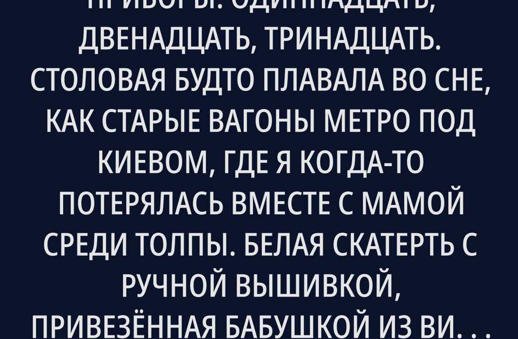 Я расставляла столовые приборы: одиннадцать, двенадцать, тринадцать. Столовая будто плавала во сне, как старые вагоны метро под Киевом, где я когда-то потерялась вместе с мамой среди толпы. Белая скатерть с ручной вышивкой, привезённая бабушкой из Винницы снег казался морской пеной, застилавшей стол, салфетки угрожали уплыть, если только не прижать их бокалами.
