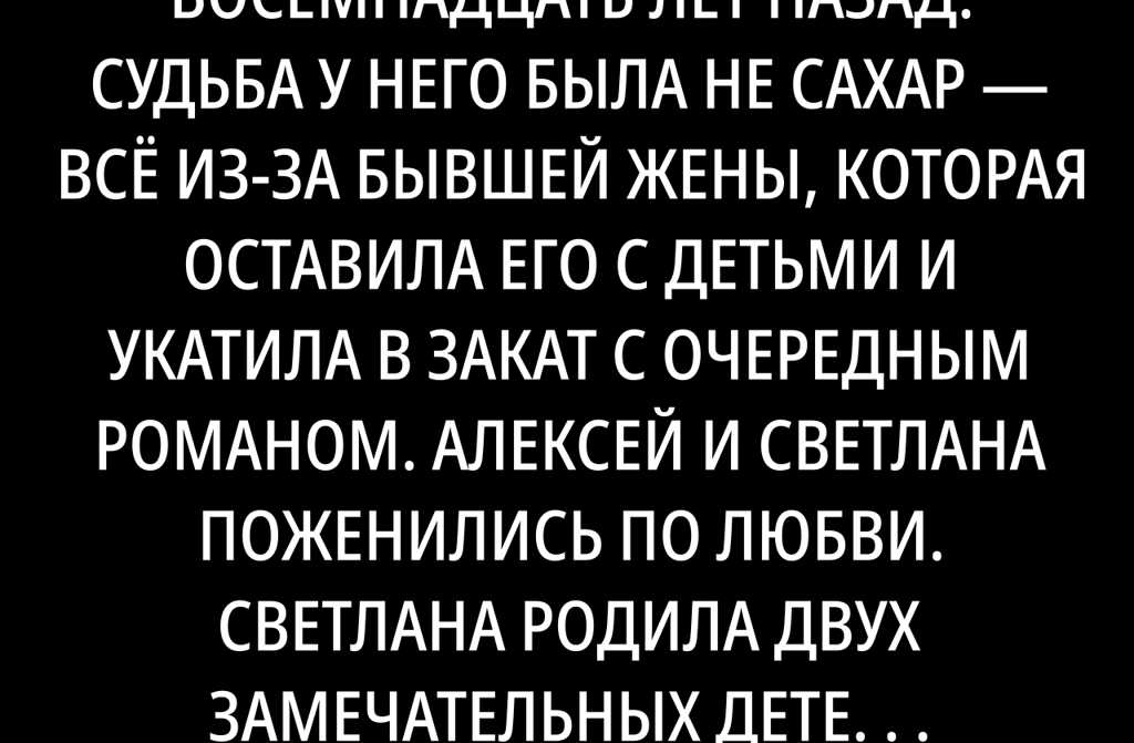 Я вышла замуж за Алексея восемнадцать лет назад. Судьба у него была не сахар всё из-за бывшей жены, которая оставила его с детьми и укатила в закат с очередным романом. Алексей и Светлана поженились по любви. Светлана родила двух замечательных детей: сына Серёжу и дочку Олесю. Когда Серёже было четыре года, а Олесе три, Алексея выгнали с работы. Семье наступили не самые весёлые времена: Светлана металась, подрабатывала всеми способами, чтобы хоть как-то прокормить детей. Алексей же в это время находил себя где? Конечно, в гараже с друзьями. Единственное его занятие ругать правительство и жаловаться на жизнь за стаканом “чайку”. Светлана выдохлась, и тут как раз начал ухаживать за ней местный предприниматель с тугим кошельком.