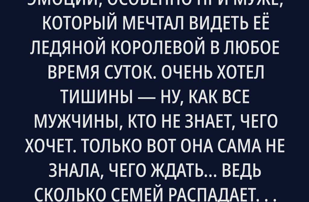 Она решила никаких эмоций, особенно при муже, который мечтал видеть её ледяной королевой в любое время суток. Очень хотел тишины ну, как все мужчины, кто не знает, чего хочет. Только вот она сама не знала, чего ждать Ведь сколько семей распадается, когда чувства улетучиваются, а модель идеальной жизни с глянцевых обложек так и остаётся мечтой. Когда развод стал фактом, не хобби уже, а реальностью, ей пришлось найти работу устроилась работать ночными сменами. Тут объявилась проблема: маленький сын, которому нужен постоянный присмотр. Конечно, был детский сад, но в 19:00 двери захлопывались и хоть стой, хоть падай, детей там не оставляют ни на минуту дольше.