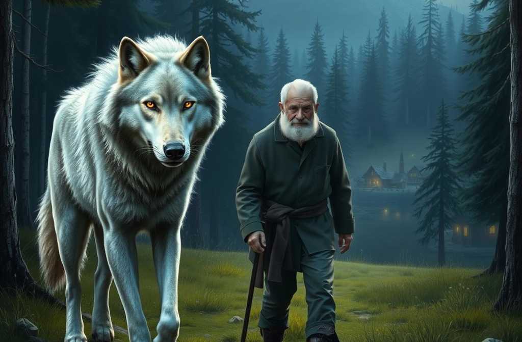С трудом, почти без сил, старик ухватился за его шею. Волк поднялся и понёс его сквозь тёмный лес. Старик слышал, как хрустят под лапами ветки, видел мелькающие тени других зверей, но никто не смел приблизиться.