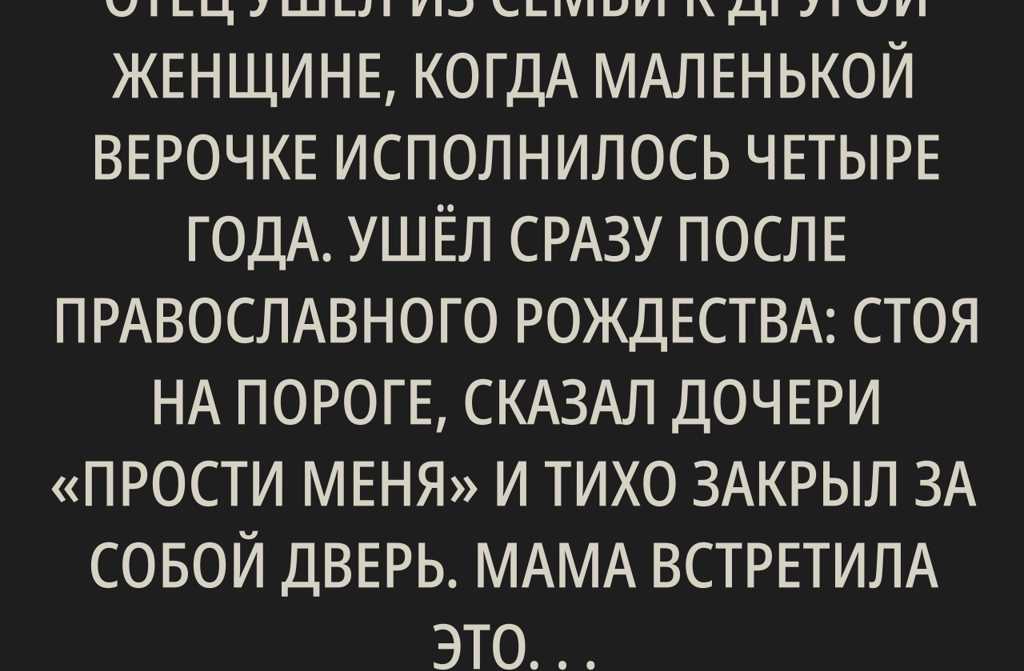 Отец ушёл из семьи к другой женщине, когда маленькой Верочке исполнилось четыре года. Ушёл сразу после православного Рождества: стоя на пороге, сказал дочери «прости меня» и тихо закрыл за собой дверь.