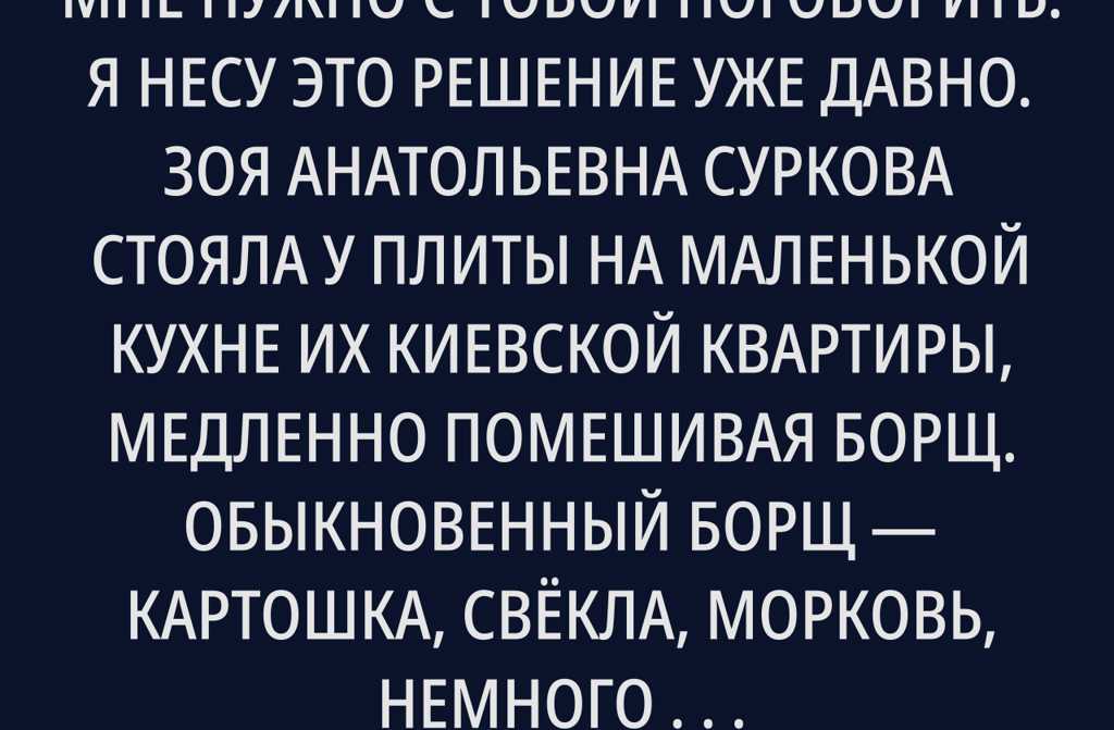 Зоя Анатольевна Суркова стояла у плиты на маленькой кухне их киевской квартиры, медленно помешивая борщ. Обыкновенный борщ картошка, свёкла, морковь, немного лука. Она не обернулась сразу. В голосе мужа чтото звякснуло, чего не было, когда речь шла о квартплате или об усталости на работе. Там вдруг появилась заранее заготовленная твёрдость.