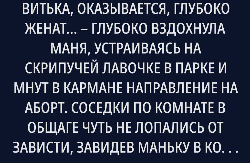 Вот тебе и сюрприз: Витька, оказывается, глубоко женат… глубоко вздохнула Маня, устраиваясь на скрипучей лавочке в парке и мнут в кармане направление на аборт.
