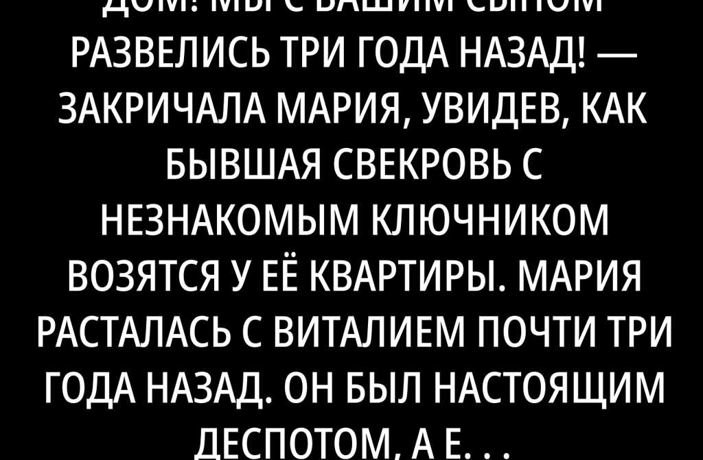 Да вы с ума сошли? Это мой дом! Мы с вашим сыном развелись три года назад! закричала Мария, увидев, как бывшая свекровь с незнакомым ключником возятся у её квартиры.
