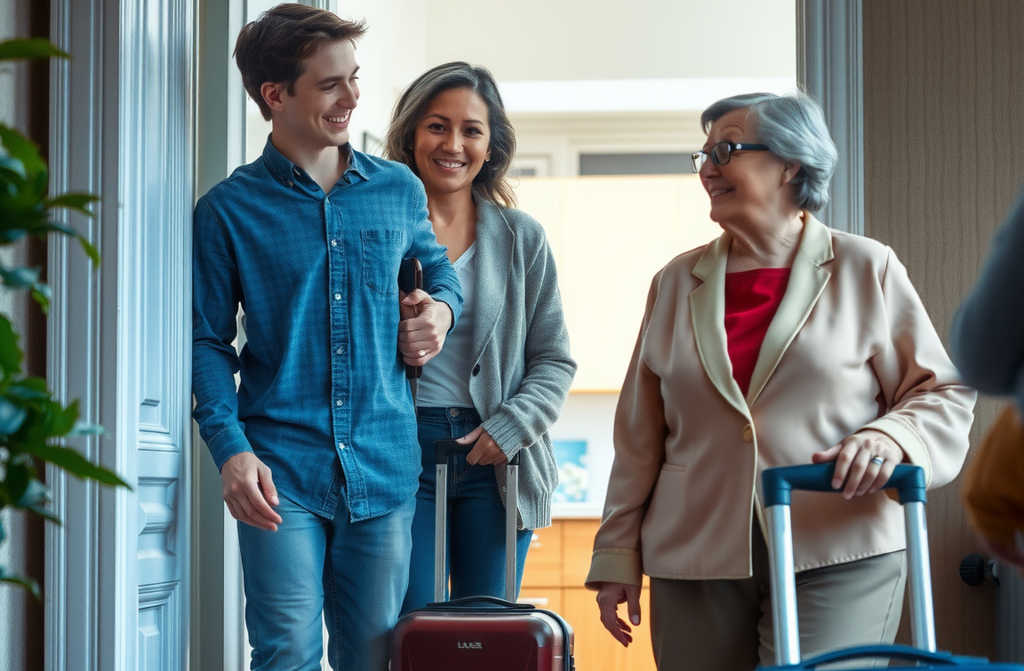 Ну, ты что, не узнала дядю своего? Я за тобой смотрела в детстве! А вот (кивает на парня) это твой двоюродный брат, он поступил в университет у вас тут, а жить ему негде. Вот решили пусть пока у тебя, потом кровать докупим, всё наладится. Да, и подарки тебе привезли! Отец твой не звонил?