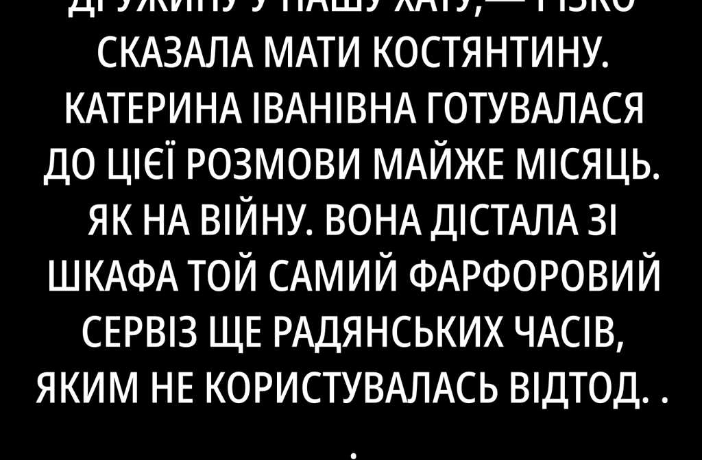 Катерина Іванівна готувалася до цієї розмови майже місяць. Як на війну. Вона дістала зі шкафа той самий фарфоровий сервіз ще радянських часів, яким не користувалась відтоді, як Костя був школярем. Спекла пиріг з яблуками і корицею улюблений Костіного дитинства. По лінійці розставила чашки на столі.