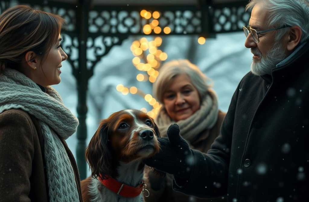 Время шло, снег не утихал. В домах мелькали ёлки. Многие в квартирах уже сидели за столом, провожая старый год. Вдруг у ног Татьяны и Ивана появилась собака.