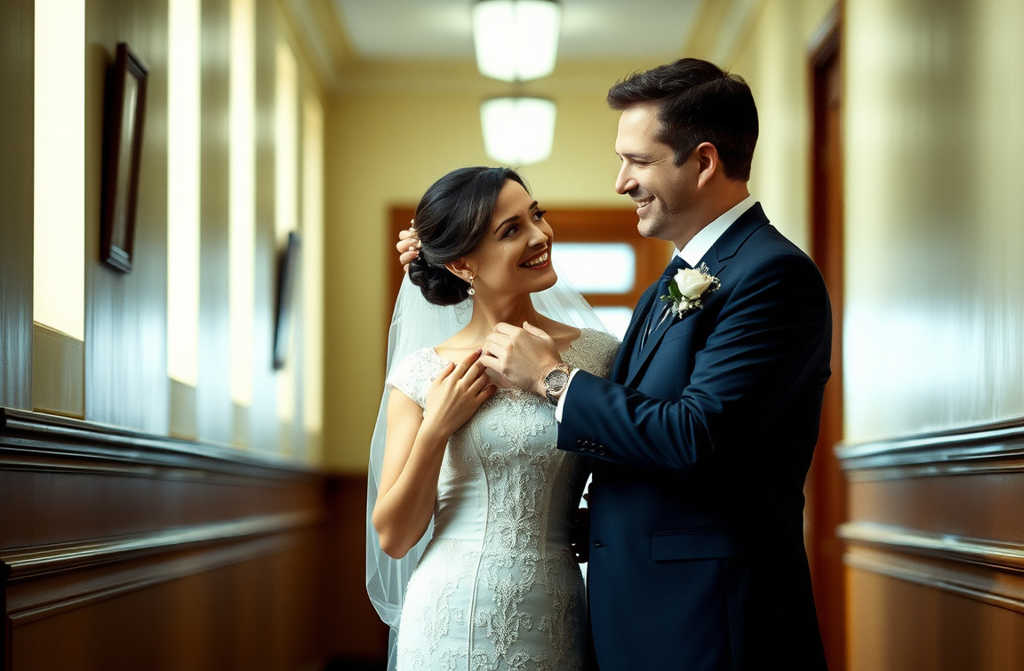 Вышли мы к коридору. Муж бережно поправил мне фату, которая сбилась.