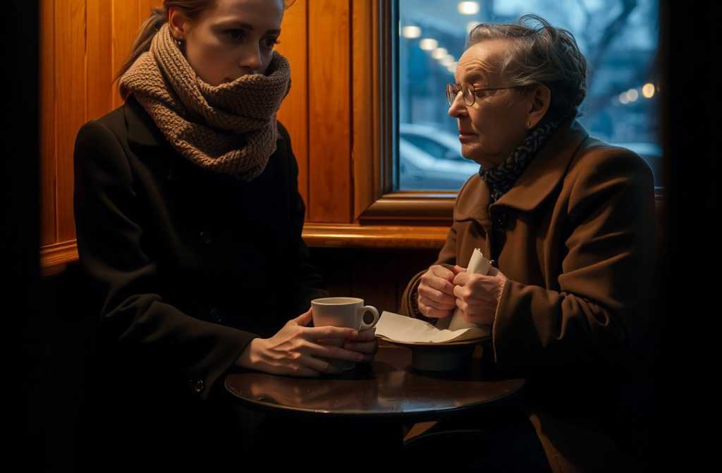 Они проходят внутрь. Тёплый воздух с запахом кофе обволакивает, влажный ноябрьский холод сразу теряет власть над ними. Мария уверенно выбирает столик у окна, раскладывает шарф на стул. Женщина идёт следом, едва оглядываясь по сторонам явно не привыкла к таким заведениям.