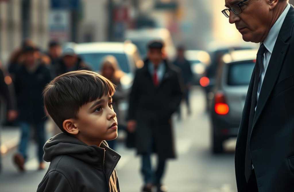 Оглянулся. Передо мной стоял худенький мальчишка лет семи. В руках крошечный свёрток, из которого выглядывало личико малышки. Девочка, завёрнутая в потрёпанный плед, тихо хныкала. Мальчик прижимал её к себе так, будто был её последней защитой в этом равнодушном мире.
