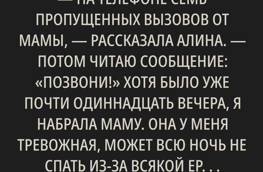 Я выхожу из спортзала и вижу на телефоне семь пропущенных вызовов от мамы, рассказала Алина. Потом читаю сообщение: «Позвони!» Хотя было уже почти одиннадцать вечера, я набрала маму. Она у меня тревожная, может всю ночь не спать из-за всякой ерунды. Мама попросила приехать к ней, плакала и сказала, что случилось что-то, из-за чего, возможно, свадьба отменяется.