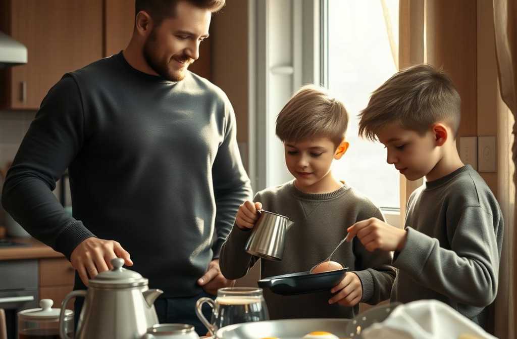 Врываются «наши». Старший (родился на пять минут раньше) заваривает чай, младший ставит сковороду его очередь завтрак готовить.
