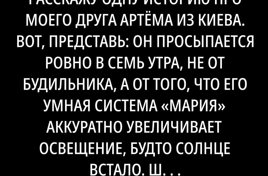 Слушай, я тебе расскажу одну историю про моего друга Артёма из Киева. Вот, представь: он просыпается ровно в семь утра, не от будильника, а от того, что его умная система «Мария» аккуратно увеличивает освещение, будто солнце встало. Шторы сами открываются, пропуская холодный ноябрьский свет киевского утра, а температура в спальне поднимается с ночных восемнадцати до комфортных двадцати двух.