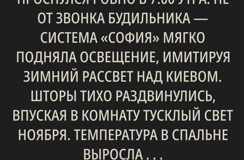 Аркадий проснулся ровно в 7:00 утра. Не от звонка будильника система «София» мягко подняла освещение, имитируя зимний рассвет над Киевом. Шторы тихо раздвинулись, впуская в комнату тусклый свет ноября. Температура в спальне выросла с ночных восемнадцати до уютных двадцати двух градусов.