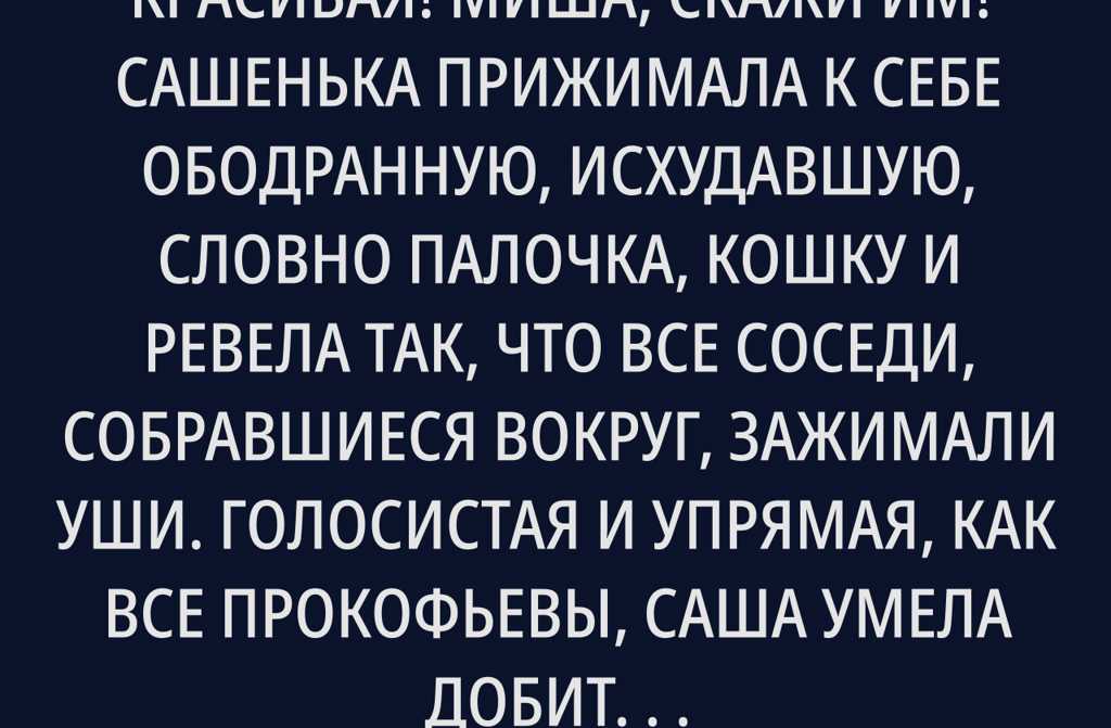 Голосистая и упрямая, как все Прокофьевы, Саша умела добиться своего если не словом, так хотя бы криком. В свои пять лет ей не было равных во дворе по умению визжать так, что содрогались стекла.