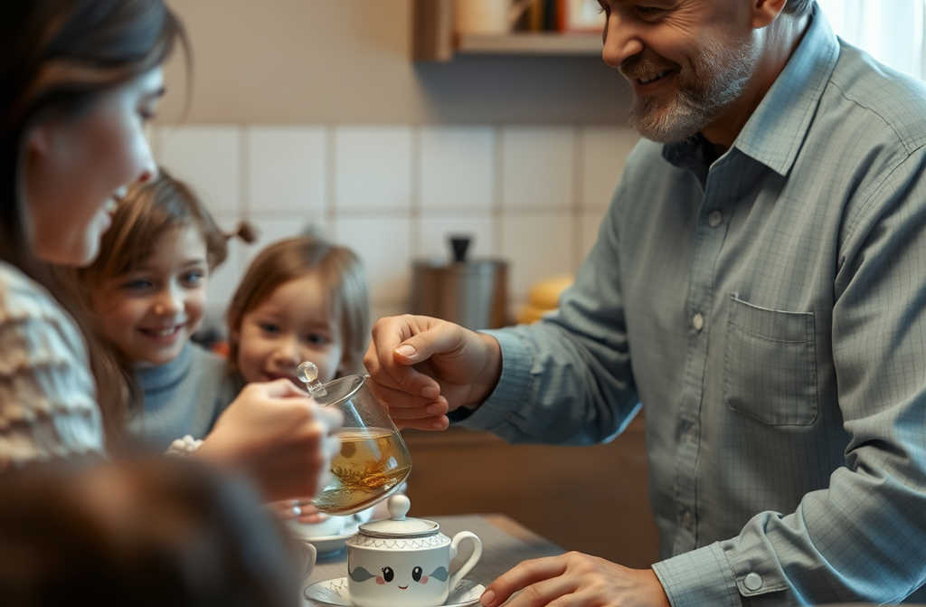 Максим, попивая чай, наблюдает за детьми, сидящими на диване.