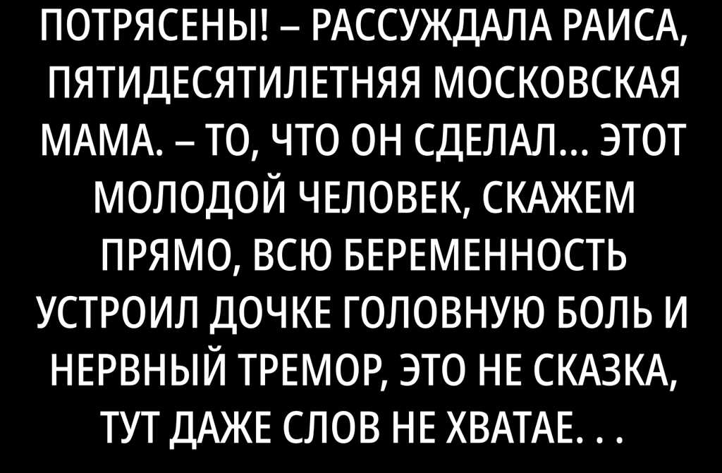 Мы с мужем были просто потрясены! рассуждала Раиса, пятидесятилетняя московская мама. То, что он сделал… этот молодой человек, скажем прямо, всю беременность устроил дочке головную боль и нервный тремор, это не сказка, тут даже слов не хватает… Он отправил её на аборт, выгнал из арендованной квартиры, а потом всем рассказал, что ребёнок не его, дескать «сам бог наказал». Я уже не знаю, сколько нервных клеток он мне сжёг честно!