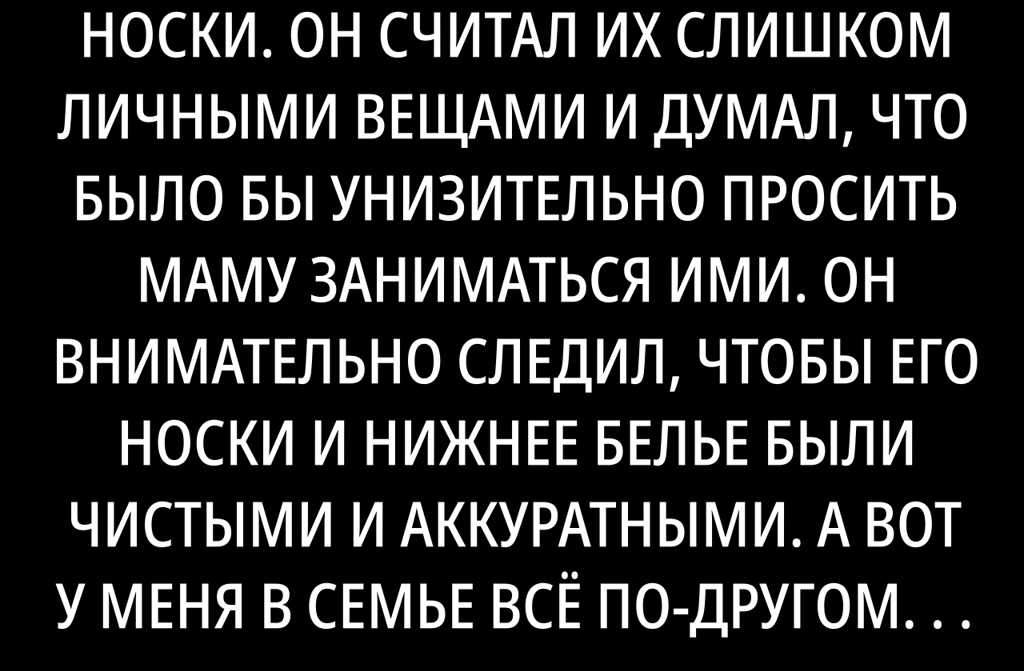 Отец всегда сам стирал свои носки. Он считал их слишком личными вещами и думал, что было бы унизительно просить маму заниматься ими. Он внимательно следил, чтобы его носки и нижнее белье были чистыми и аккуратными.