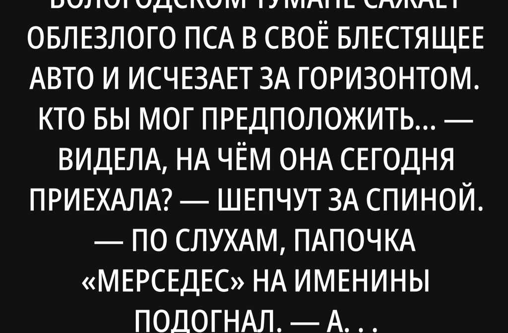 Гламурная девушка в вологодском тумане сажает облезлого пса в своё блестящее авто и исчезает за горизонтом. Кто бы мог предположить