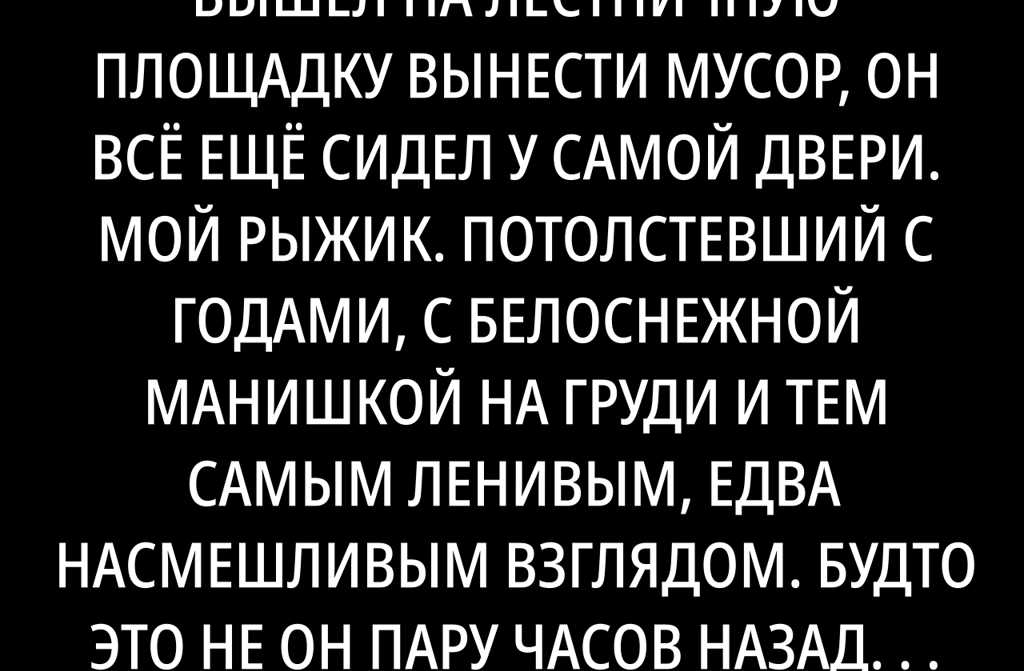 Когда я вышел на лестничную площадку вынести мусор, он всё ещё сидел у самой двери. Мой Рыжик. Потолстевший с годами, с белоснежной манишкой на груди и тем самым ленивым, едва насмешливым взглядом. Будто это не он пару часов назад носился по кухне и с грохотом уронил крышку от кастрюли. Я кивнул Рыжик и ухом не повёл.
