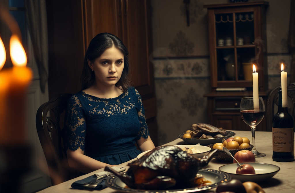 Лариса поправляла белую льняную скатерть на кухонном столе, пальцы её дрожали от усталости и волнения. Сегодня они с Сергеем отмечали двадцать пятую годовщину свадьбы серебряную! Она с самого утра колдовала над праздничным ужином: на плите томлелась утка с черносливом, в духовке подрумянивалась картошка с укропом, а на тарелке уже красовался салат с гранатом Сергей обожал эту кислинку. Кухня пахла корицей, ванилью от яблочного пирога и воском от трёх свечей в старых подсвечниках. На столе стояла бутылка «Каберне» того самого вина, что они пили на свадьбе. Лариса специально заказала его в магазине «Винный двор». Она надела тёмно-синее платье с кружевами, распустила волосы, которые обычно собирала в хвост, и даже накрасила губы впервые за последние пять лет.