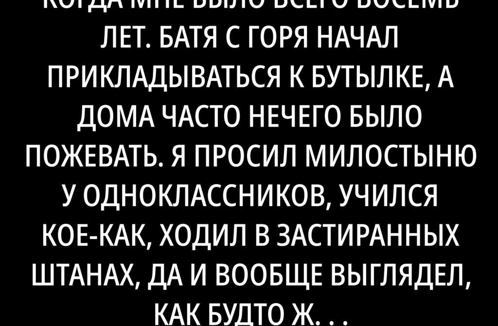 Моя мама ушла из жизни, когда мне было всего восемь лет. Батя с горя начал прикладываться к бутылке, а дома часто нечего было пожевать. Я просил милостыню у одноклассников, учился кое-как, ходил в застиранных штанах, да и вообще выглядел, как будто жизнь меня уже раза три раскрутила.
