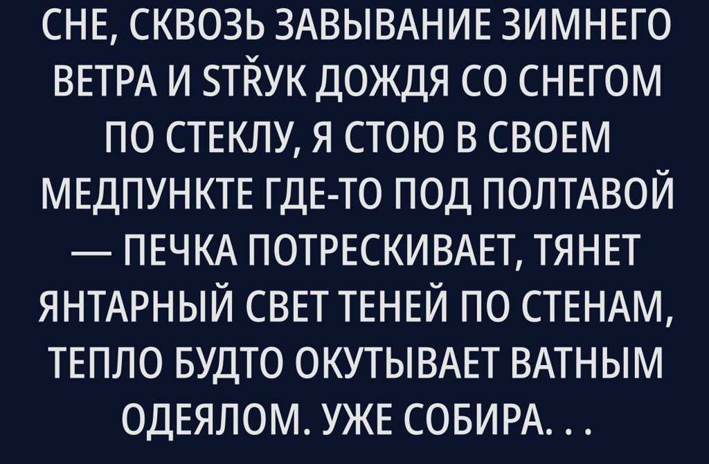 Будто во сне, сквозь завывание зимнего ветра и střук дождя со снегом по стеклу, я стою в своем медпункте где-то под Полтавой печка потрескивает, тянет янтарный свет теней по стенам, тепло будто окутывает ватным одеялом. Уже собиралась уходить в свой сон, как вдруг дверь заныла, и прямо из ноябрьской стужи вырос во дворе Фёдор Архипов. Громадный, плечистый, но сейчас его согнуло, будто тот самый ветер чуть не унес прочь. А на руках крошка-девочка, его дочка, Дария.