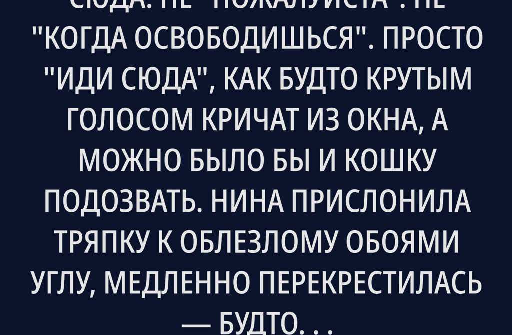 Нина прислонила тряпку к облезлому обоями углу, медленно перекрестилась будто отгоняет сон, и вступила в кухню. Белый свет лампы странно дрожал, и в нем плавали Игорь за столом и его мать, Татьяна Матвеевна, которая, как всегда, уже пила свой вечерний чай. В кислом мареве капусты и горьких лекарств у окна казалось, будто отовсюду смотрят глаза и слышится топот чьих-то невидимых тапочек.
