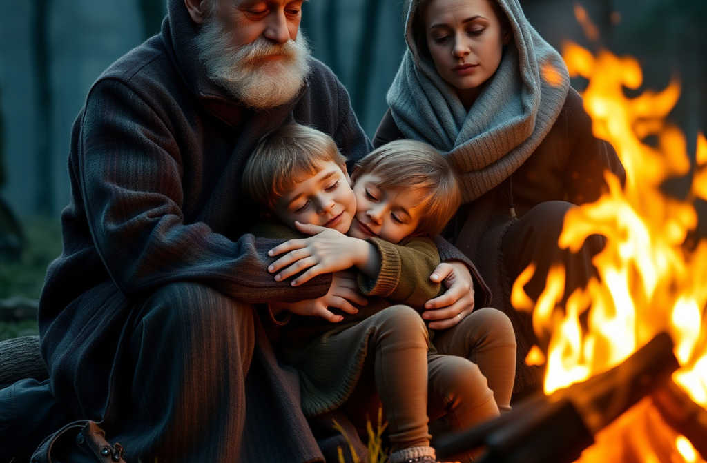 Ночью мальчик дрожал от звуков леса, но держал деда рядом, укрывшись лапником. Когда огонь стал гаснуть, он героически встал и подкинул дров: