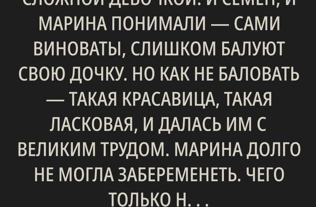 Беременность оказалась очень тяжёлой. Семён не раз думал, что Марина не сможет донести ребенка. Жену тошнило каждое утро, она не могла есть и даже запахи переносила болезненно; отёки рук и ног, бессонные ночи. Во двор выходила через раз. Когда схватки начались, Семён вздохнул с облегчением но всё только начиналось. Почти 12 часов Марина мучилась, после чего врачи приняли решение делать кесарево. Девочка родилась слабенькая, истощённая. Марина потеряла много крови и два дня балансировала на краю жизни и смерти, но всё закончилось благополучно. Мать с дочкой месяц лежали в детской больнице, а дома Семён не находил себе места от волнения.