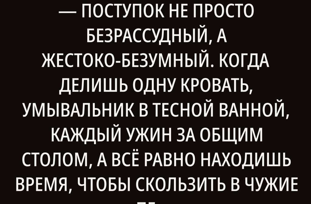 Изменять человеку, с которым ты живёшь под одной крышей, поступок не просто безрассудный, а жестоко-безумный. Когда делишь одну кровать, умывальник в тесной ванной, каждый ужин за общим столом, а всё равно находишь время, чтобы скользить в чужие переписки или искать чужие объятия, а потом возвращаться под одеяло, впитавшее запах самой преданной тебе души Тут речь не только о предательстве это тщательно просчитанное неуважение.