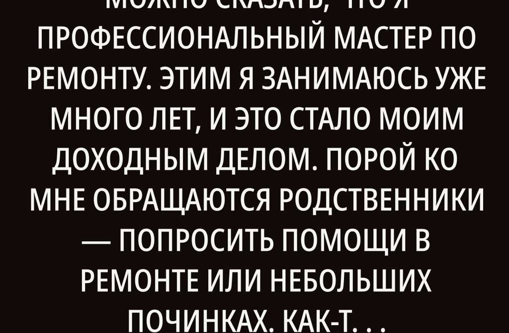 Можно сказать, что я профессиональный мастер по ремонту. Этим я занимаюсь уже много лет, и это стало моим доходным делом. Порой ко мне обращаются родственники попросить помощи в ремонте или небольших починках. Как-то раз звонит мне кузен. Беру трубку он говорит, мол, нужна твоя помощь, может, выкроишь время?