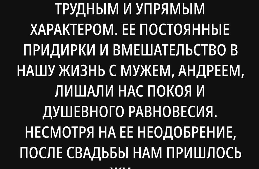В конце концов мы решили снять квартиру в Харькове и переехать, чтобы жить отдельно. Это принесло нам долгожданное облегчение и покой. Любые визиты к свекрови стали краткими, и, входя в ее дом, я принципиально отказывалась пить чай своего рода немой протест против её поведения. Думаю, Валентина Ивановна понимает причину таких моих поступков, но, похоже, ее это вовсе не волнует.