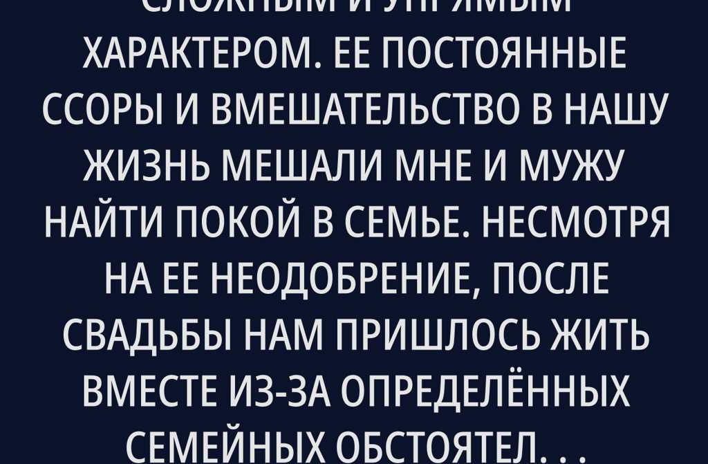 Моя свекровь обладает очень сложным и упрямым характером. Ее постоянные ссоры и вмешательство в нашу жизнь мешали мне и мужу найти покой в семье. Несмотря на ее неодобрение, после свадьбы нам пришлось жить вместе из-за определённых семейных обстоятельств. Мы часто занимались сбором лесных ягод, в основном для варенья, но остатки никогда не доставались нашей семье.
