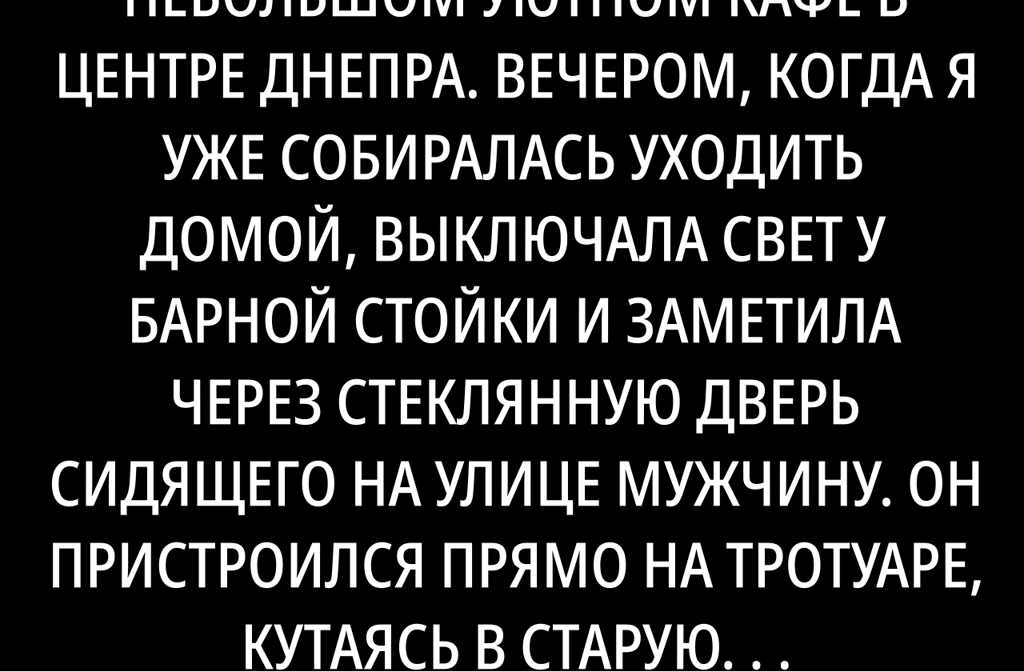 Я работала поваром в небольшом уютном кафе в центре Днепра. Вечером, когда я уже собиралась уходить домой, выключала свет у барной стойки и заметила через стеклянную дверь сидящего на улице мужчину.