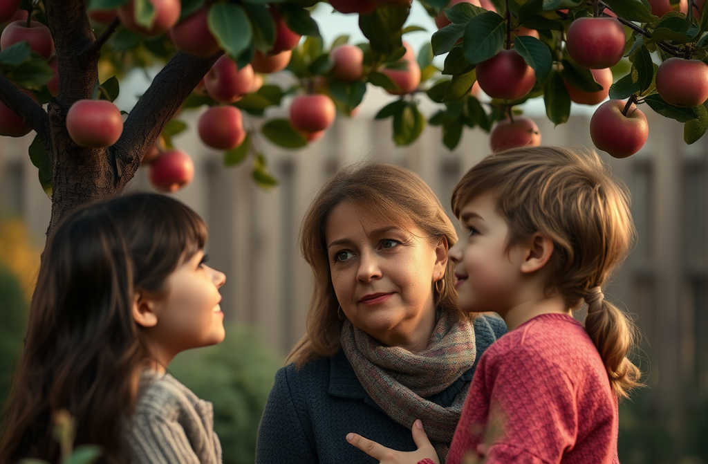 Солнце садится за горизонтом, крася старую яблоню в розовые тона именно под той же яблоней всё началось. Она растёт, как и мы. Как наша семья.