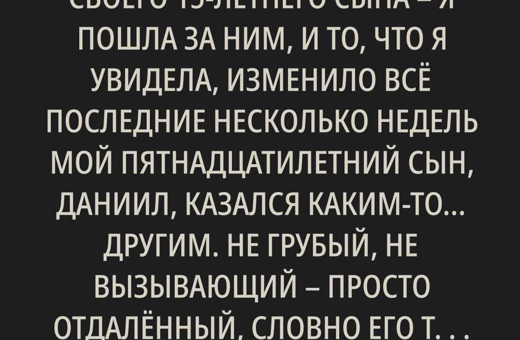 Последние несколько недель мой пятнадцатилетний сын, Даниил, казался каким-то другим. Не грубый, не вызывающий просто отдалённый, словно его тень опережала его самого. Он возвращался из школы вялым, молча исчезал в своей комнате за закрытой дверью. Почти не ел, вздрагивал, если спрашивать, куда идёт или с кем переписывается. Я думала, возможно, он влюблён вдруг в жизни подростка случилась маленькая трагедия? Ну, как водится: дети пытаются пережить такое в одиночестве.
