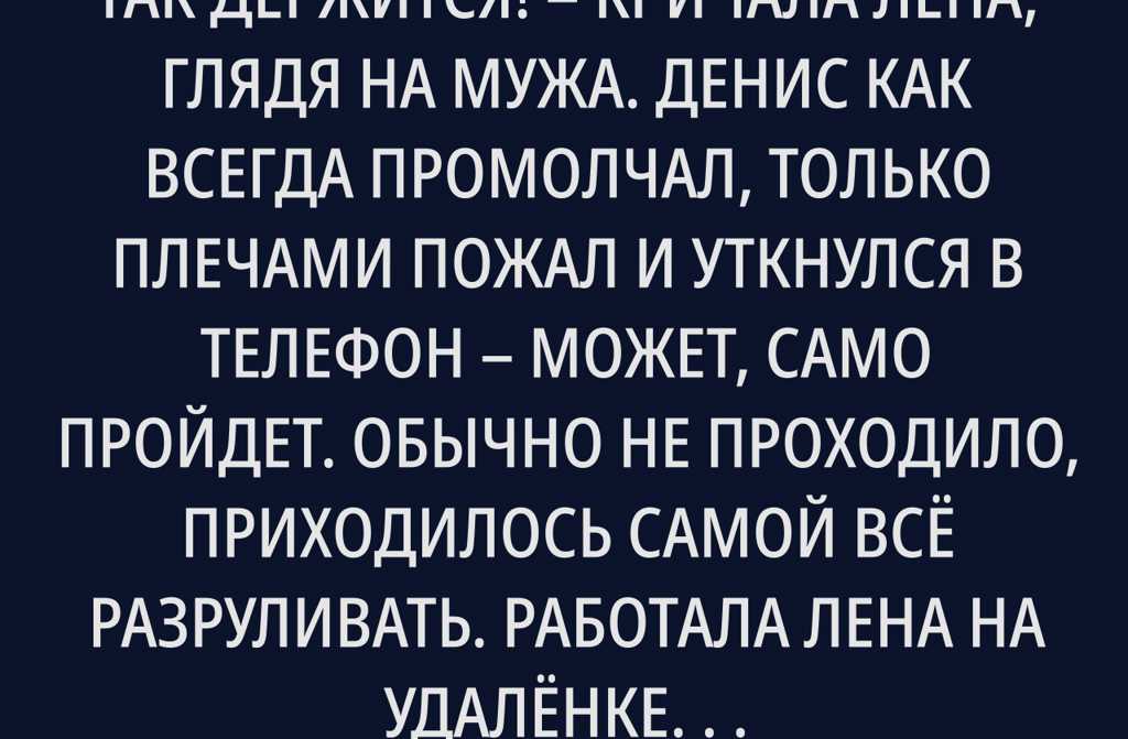 Денис как всегда промолчал, только плечами пожал и уткнулся в телефон может, само пройдет. Обычно не проходило, приходилось самой всё разруливать. Работала Лена на удалёнке, дизайнер, с компьютера дома, график свободный. Сначала платили копейки, потом повысила квалификацию и вот уже получает в разы больше Дениса. На её зарплату и кредит за машину выплачивали, и в отпуск ездили, и техника в доме вся, и одевались благодаря ей. Потом декрет Лена родила дочку, почти не сбавив темп работы не хотелось терять хороший доход.