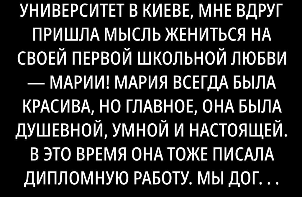 Сегодня, когда я заканчиваю университет в Киеве, мне вдруг пришла мысль жениться на своей первой школьной любви Марии! Мария всегда была красива, но главное, она была душевной, умной и настоящей. В это время она тоже писала дипломную работу. Мы договорились, что поженимся, как только защитим свои дипломы.
